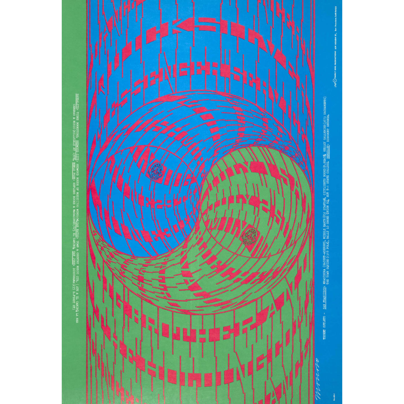For the Avalon Ballroom poster, Moscoso applied his signature lettering to the yin yang, the Chinese symbol for interdependence of contrary forces. There are up to ten known variations in color for this particular print.