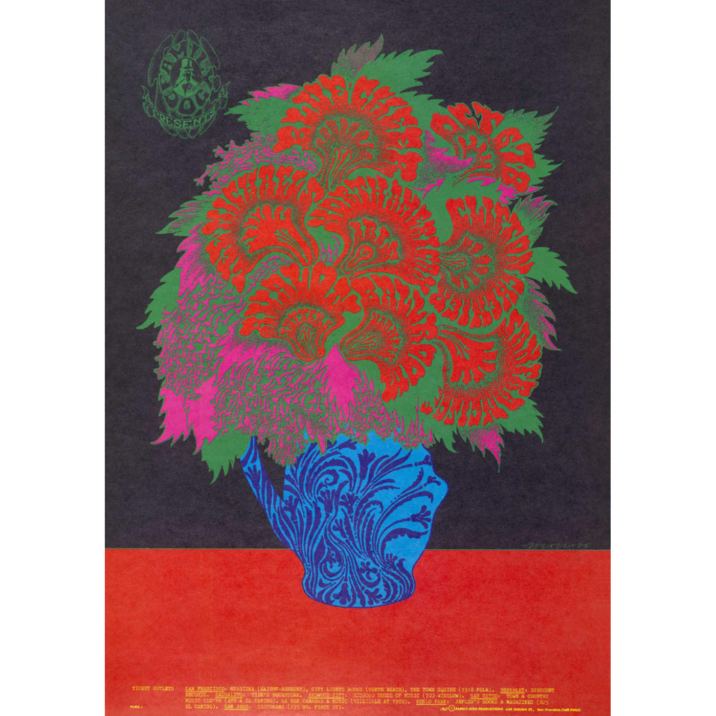 The classic image for still life gone psychedelic. Moscoso applied his signature lettering to form blossoming flowers, breathing new life into otherwise traditional imagery.